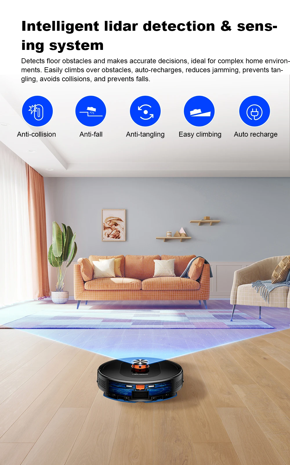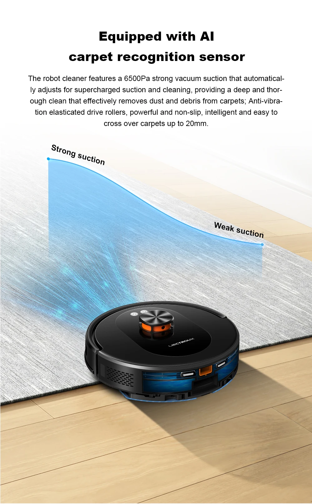 · 【20mm Obstacle Clearance】Upgraded off-road wheels allow the robot to easily cross 20mm obstacles and climb slopes up to 15°, making it easy to transition from floor to carpet cleaning and allowing smooth transitions across door thresholds between rooms.