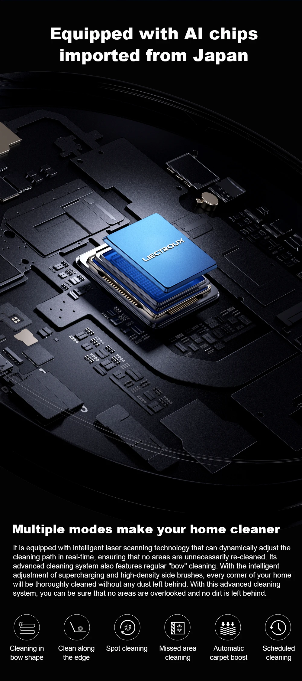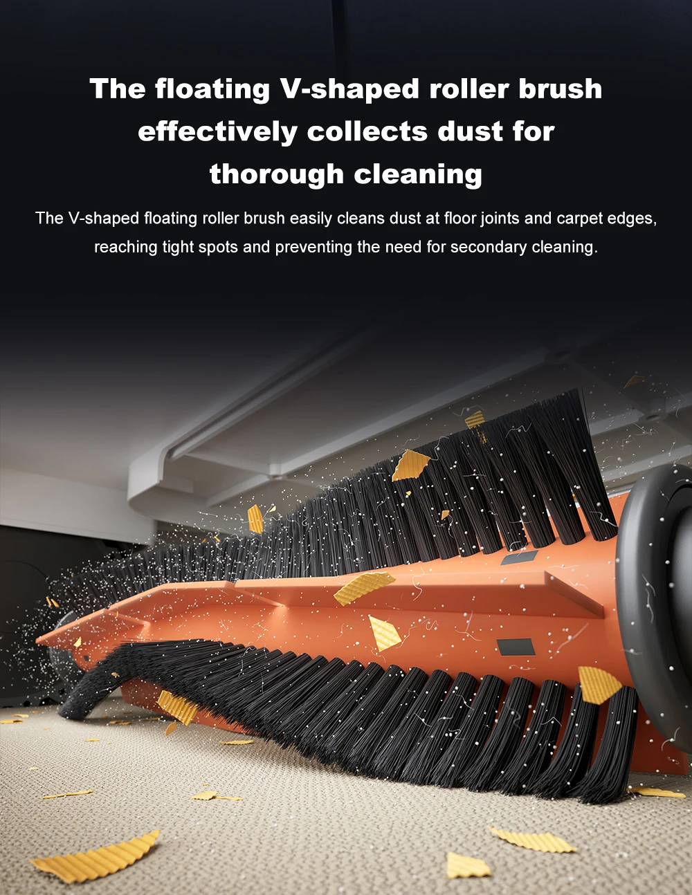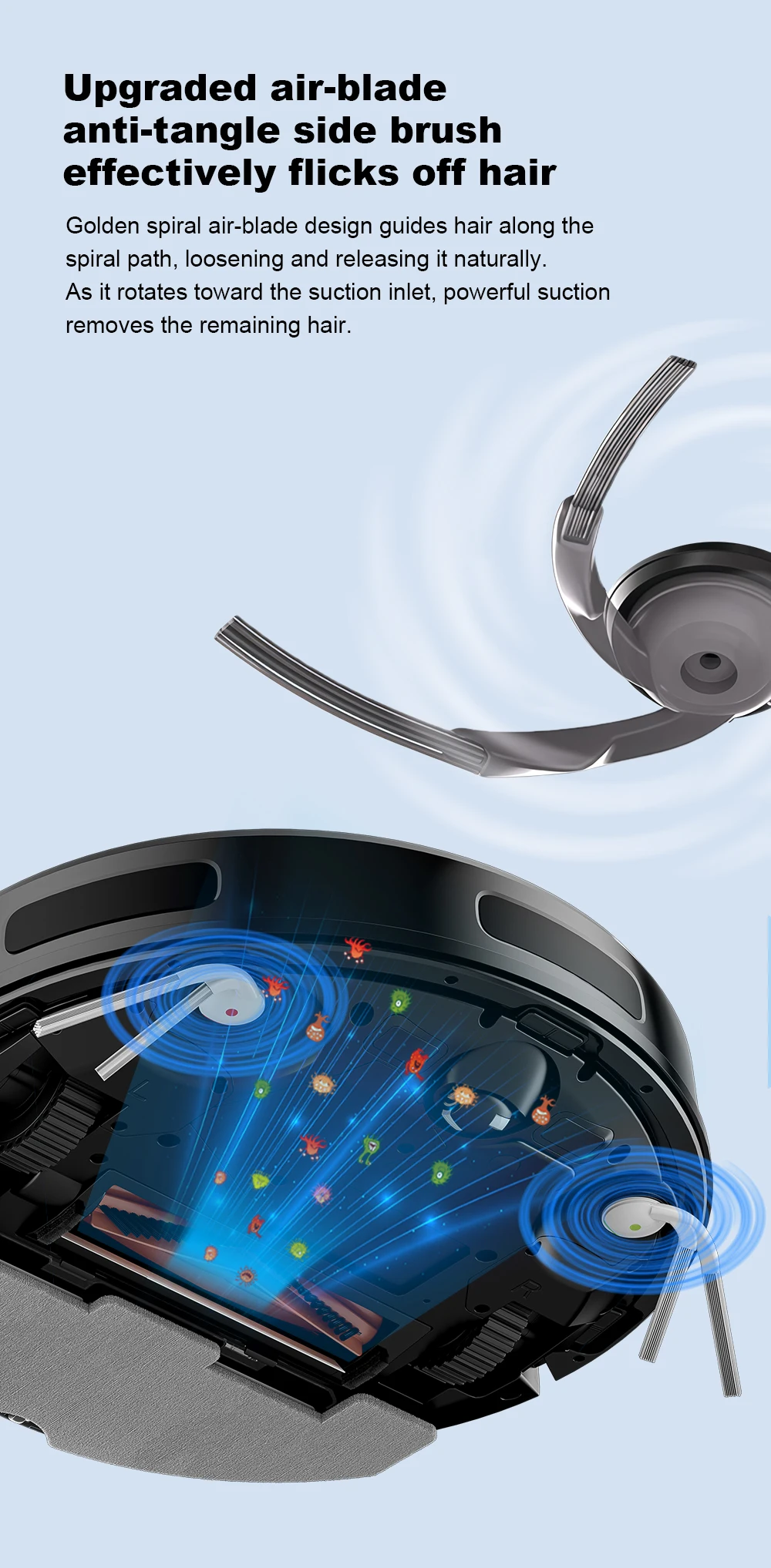 · 【Air-Blade Anti-Tangle Side Brushes】Actively prevent hair wrapping. The two air-blade side brushes are designed with a curved “wind-blade” profile that generates a guided airflow path during rotation. This airflow helps lift, loosen, and flick off trapped hair before it can wrap around the brush base. As loosened strands move toward the suction inlet, airflow and suction work together to remove them completely. This intelligent mechanical-airflow system significantly reduces hair entanglement, improves long-term cleaning efficiency, and minimizes maintenance.