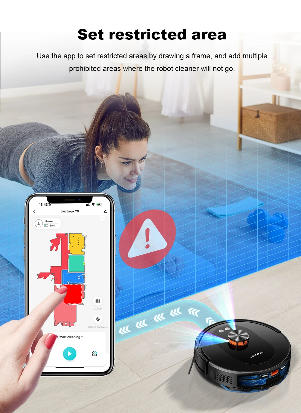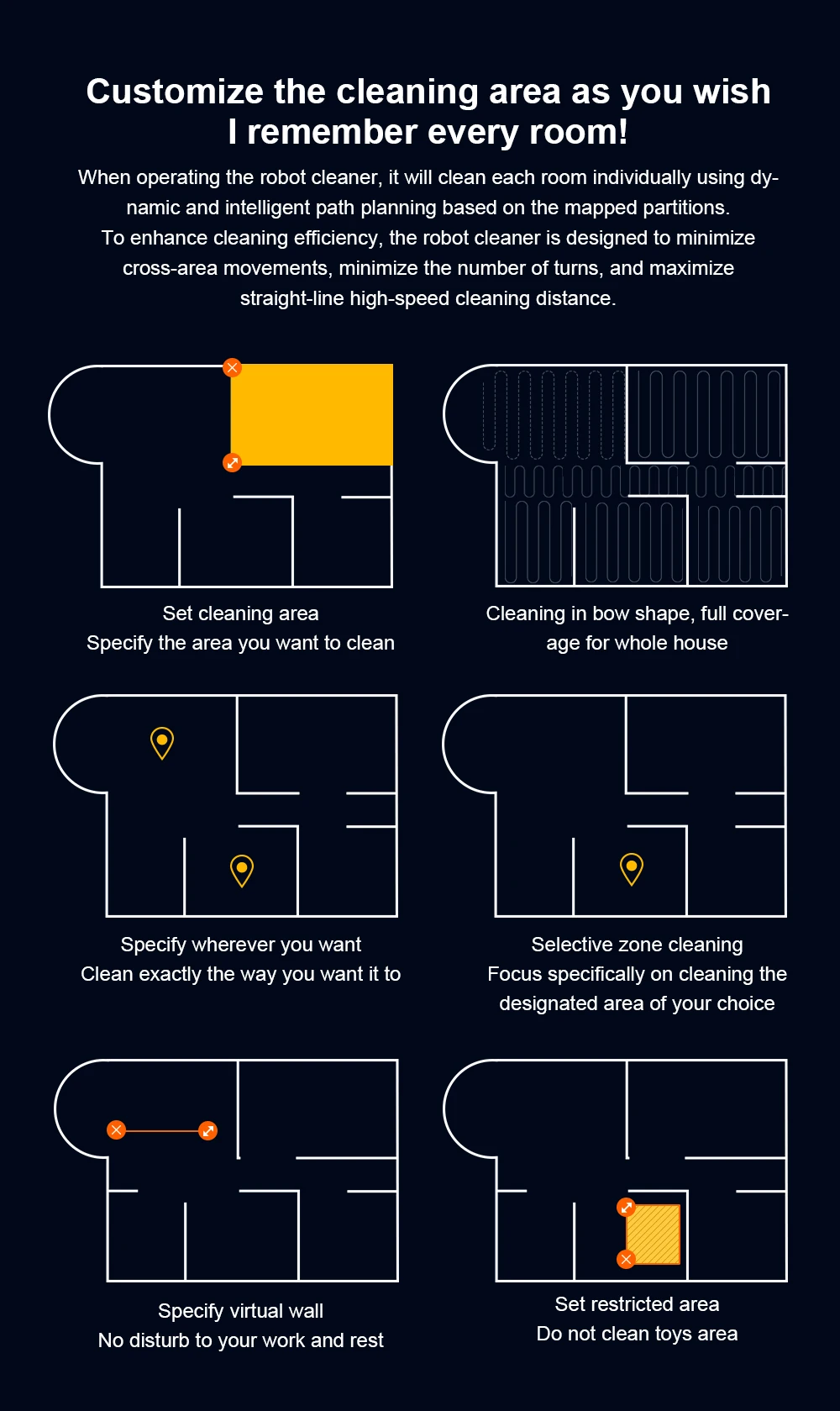 · 【Custom Cleaning + 30 Forbidden Areas】Automatic cleaning, edge cleaning, zone cleaning, spot cleaning, double cleaning, timing cleaning, Y-shaped mopping and Zigzag modes to meet your needs, you can create your own cleaning plan: set cleaning time, room cleaning sequence, suction strength, etc., You can set 30 virtual forbidden areas through the APP, to protect the carpet/pet area/children's play area to keep your robot vacuum cleaner away from the area you don't want it to enter.